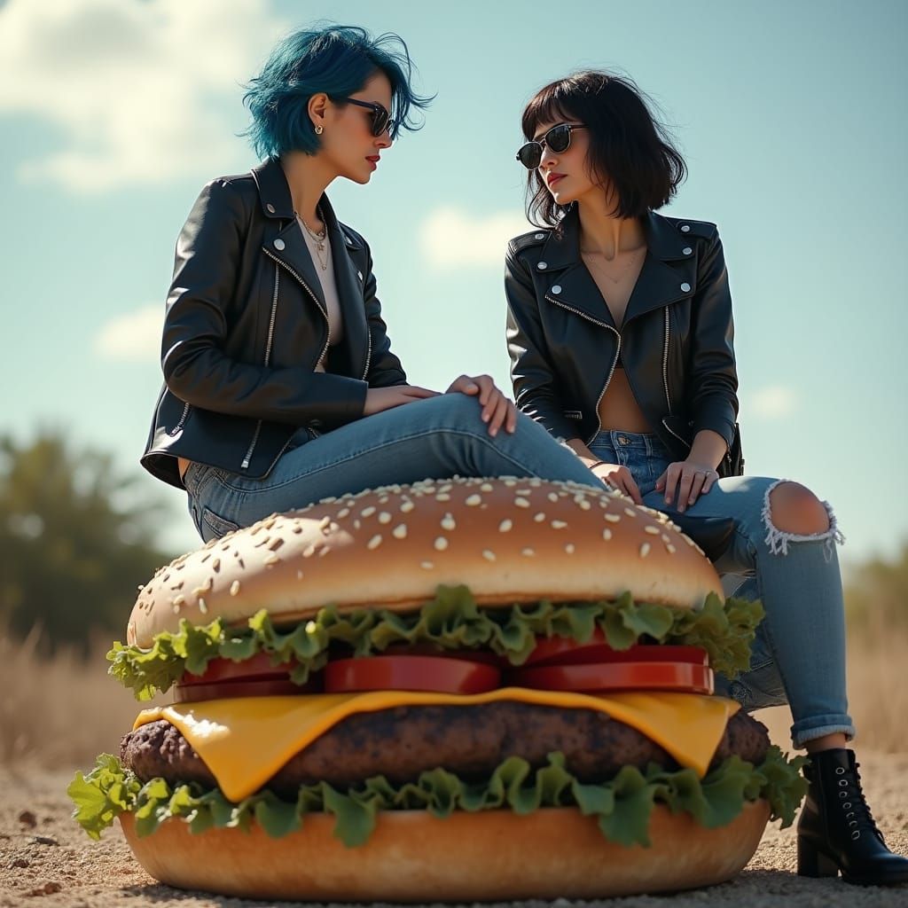 This image shows two women perched on a massive stone cheeseburger, bathed in harsh sunlight. One woman sports a black leather jacket and sunglasses, while the other has a blue bob haircut.