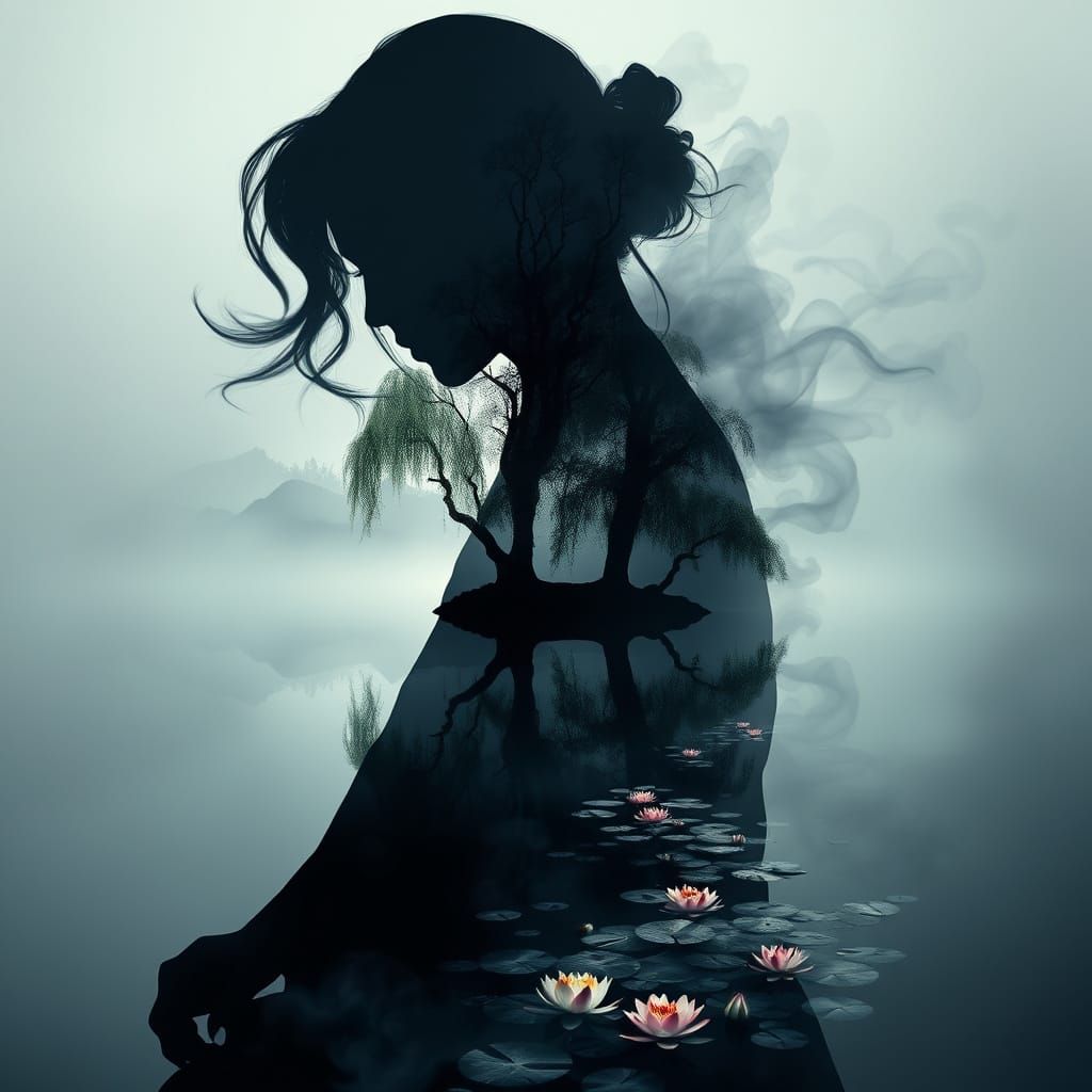 A striking picture of a woman's silhouette filled with a landscape of a lake, weeping willows and water lilies. Evokes a vintage Japanese ink painting aesthetic.