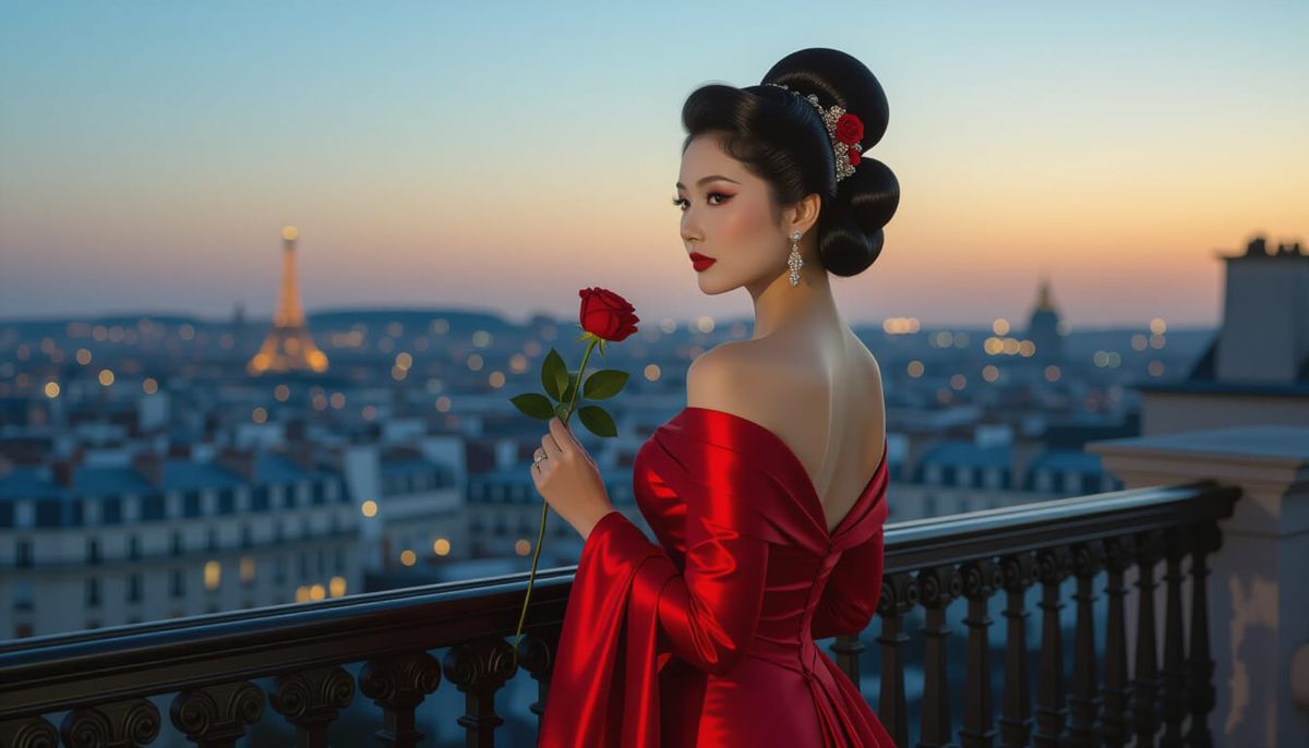 A woman in a vintage red gown on a Parisian balcony at twilight, holding a rose. Bathed in golden light with bokeh, evoking 1950s Hollywood cinema and sophisticated fashion photography.