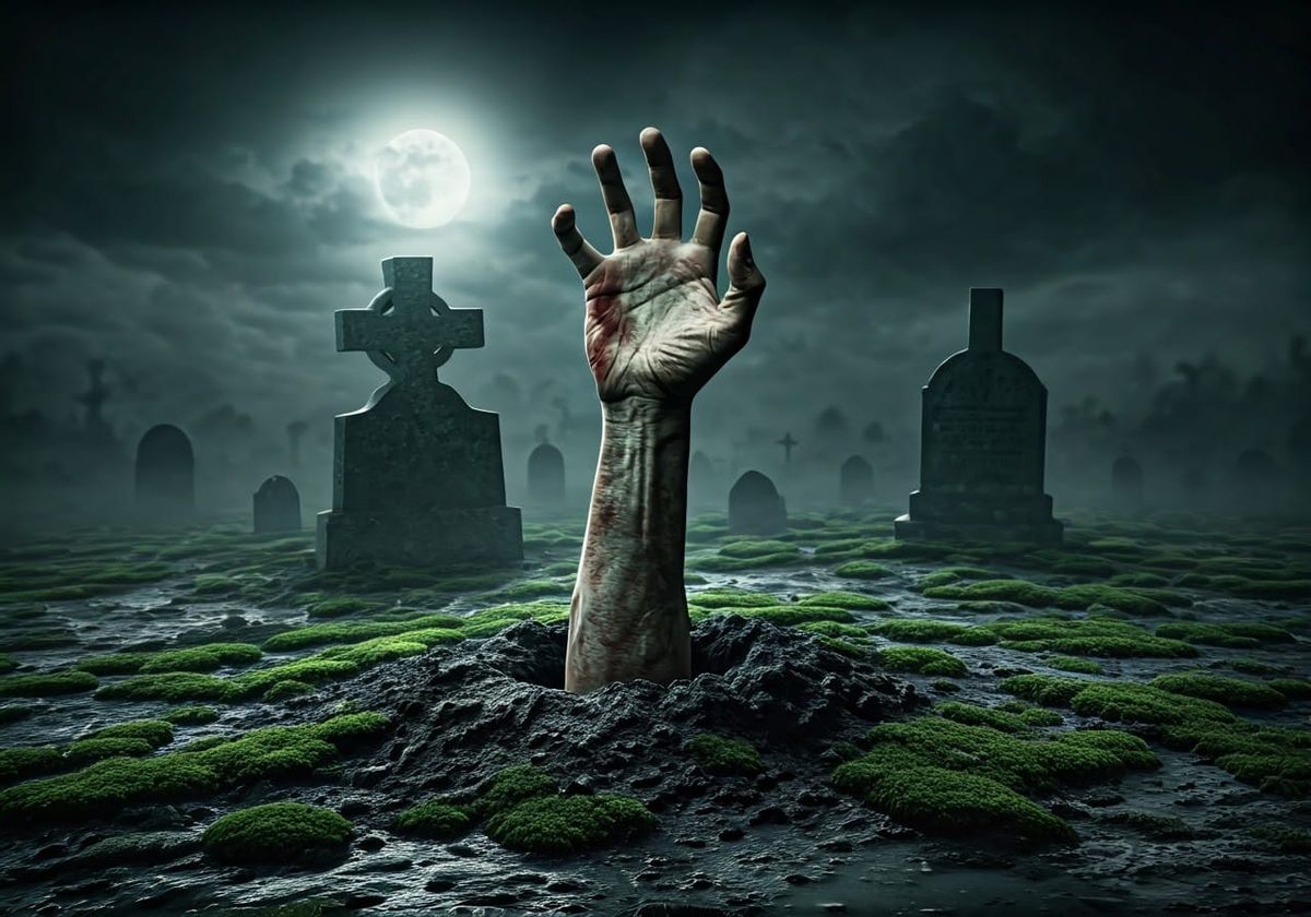 This haunting image captures a zombie hand bursting forth from a weathered grave, yearning for freedom in a moonlit graveyard, evoking the gritty horror of Night of the Living Dead.