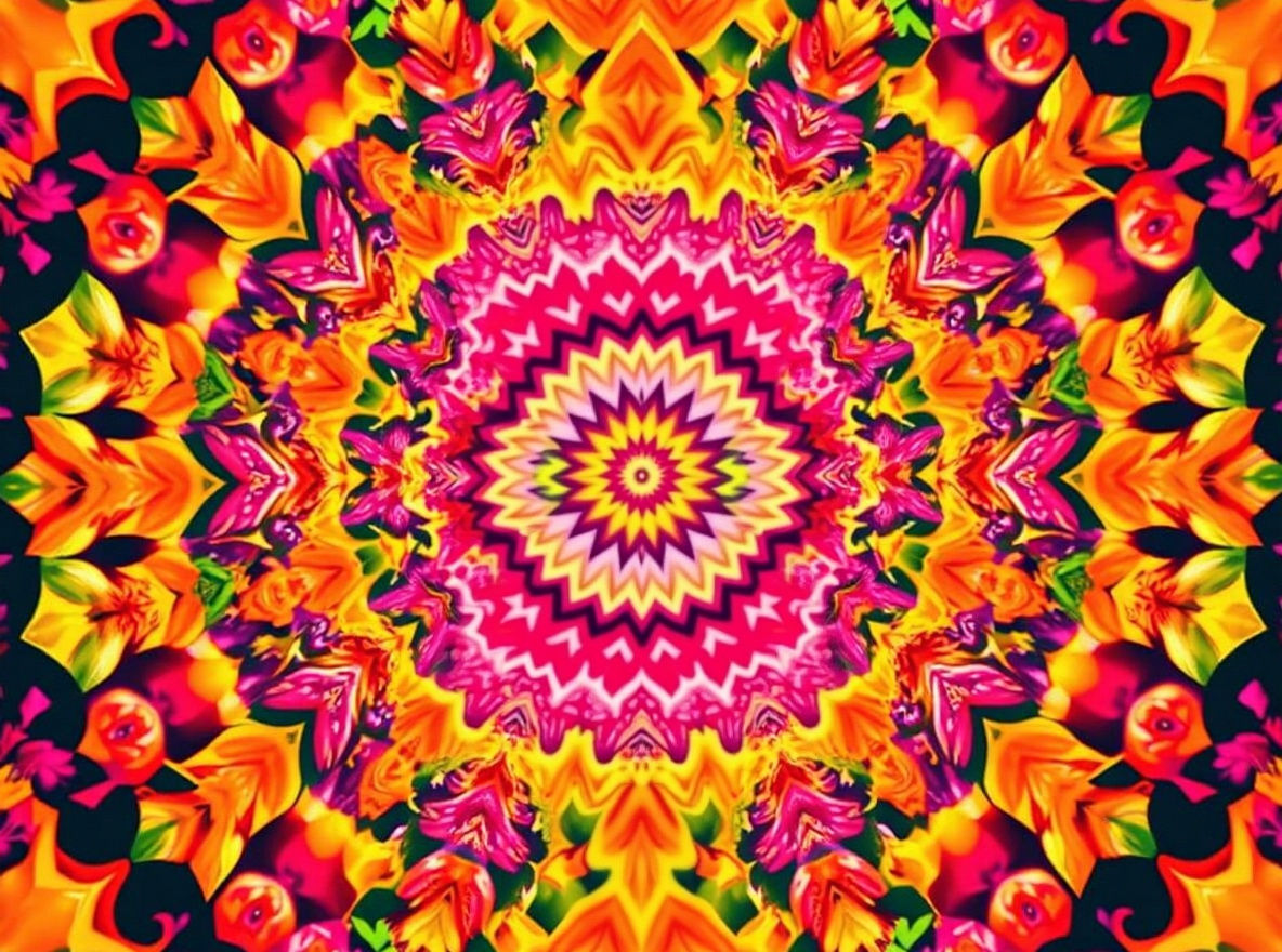 This image shows a mesmerizing kaleidoscope pattern in pink, orange, and yellow. The symmetrical shapes and neon colors create a vibrant, geometric abstraction.