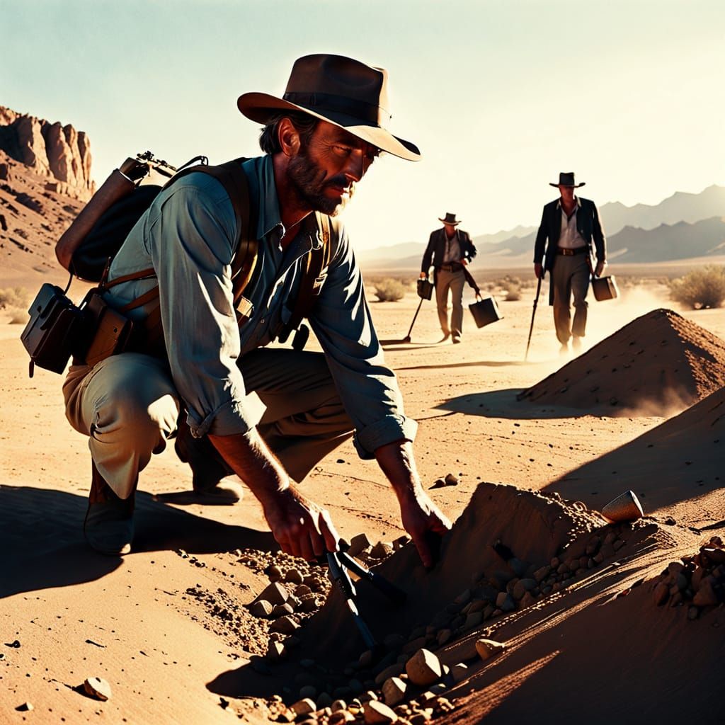 This image depicts prospectors excavating in a desert environment, reminiscent of film noir. Close-ups and medium shots highlight the scene's cinematic feel, accentuated by dramatic lighting and earthy tones.