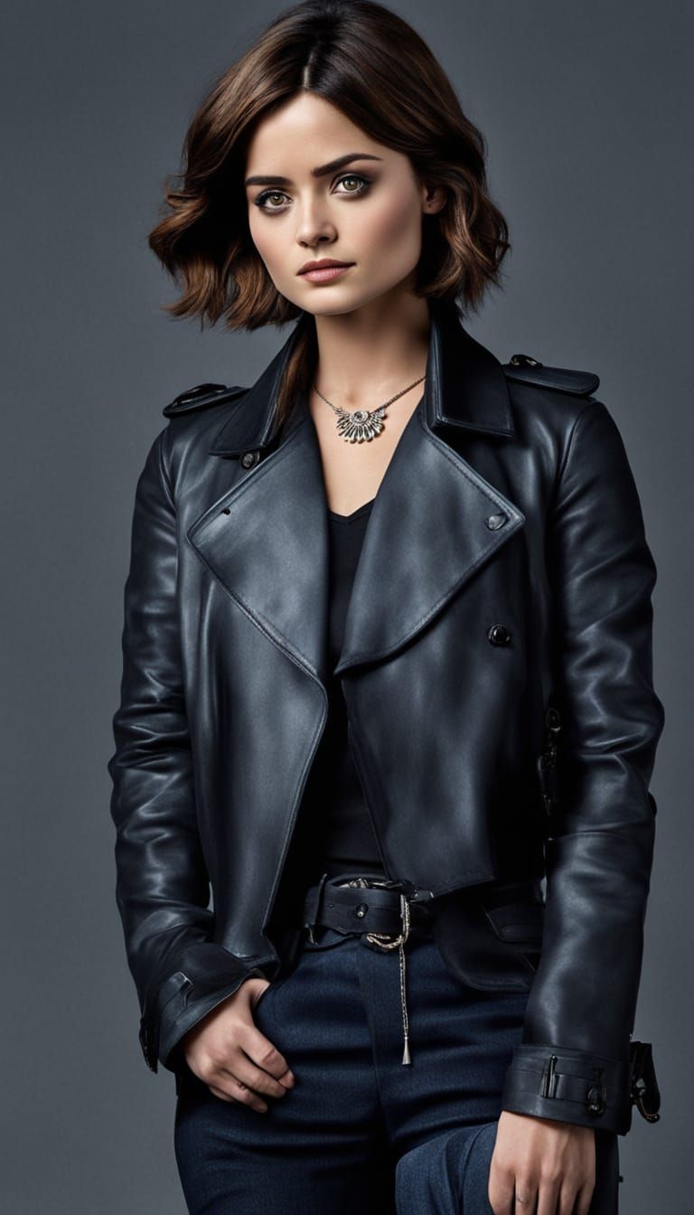 This image shows Jenna Coleman portraying Johanna Constantine in a London chapel. She is wearing a black leather trench coat, black satin T-shirt, denim jeans, and high-heeled boots in photorealistic detail.