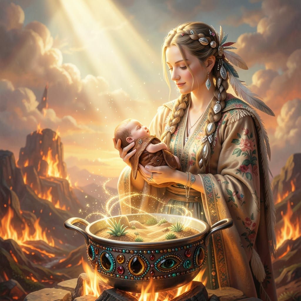 A graceful Nordic woman with braided hair threaded with feathers, shells, silver, and iridescent paint strokes, wearing hand-painted ceremonial attire, holds a little baby swathed in ceremonial leathers. Her face is bathed in magical, shimmering, ethereal golden light. She is depicted in a Gemstone ...