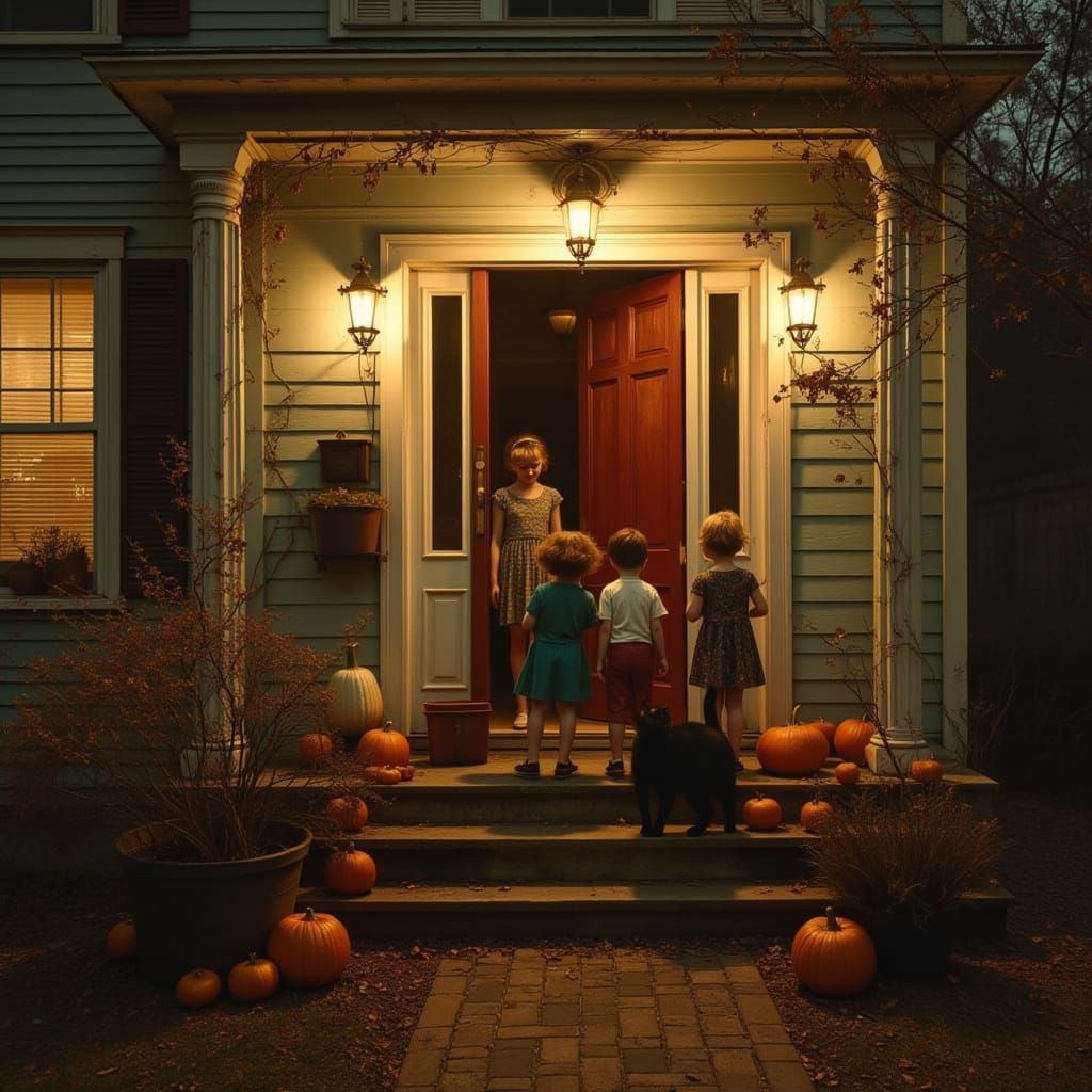 This image shows 1950s American children trick-or-treating at a vintage house porch on Halloween. Features a muted, nostalgic atmosphere with soft lighting and autumn decor.