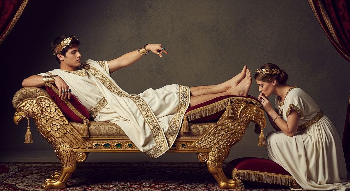 This image shows a young Roman emperor reclining on a golden chaise lounge, attended by a princess. The scene is captured with natural lighting, shallow depth of field, and sharp focus, in a style reminiscent of high-end fashion photography.