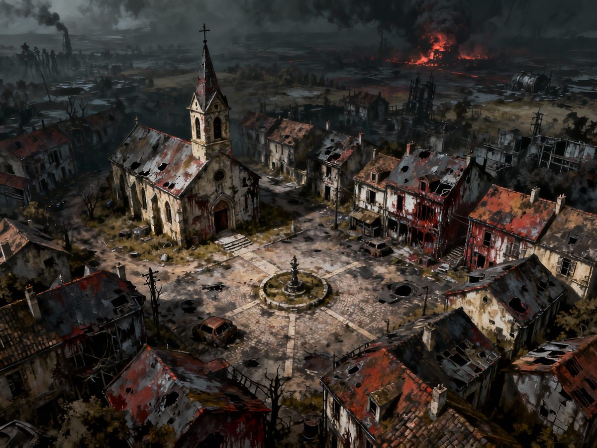 This image shows an aerial view of a small French town devastated by a nuclear apocalypse. The concept art captures a grim, atom-punk atmosphere with dark, intricate details.