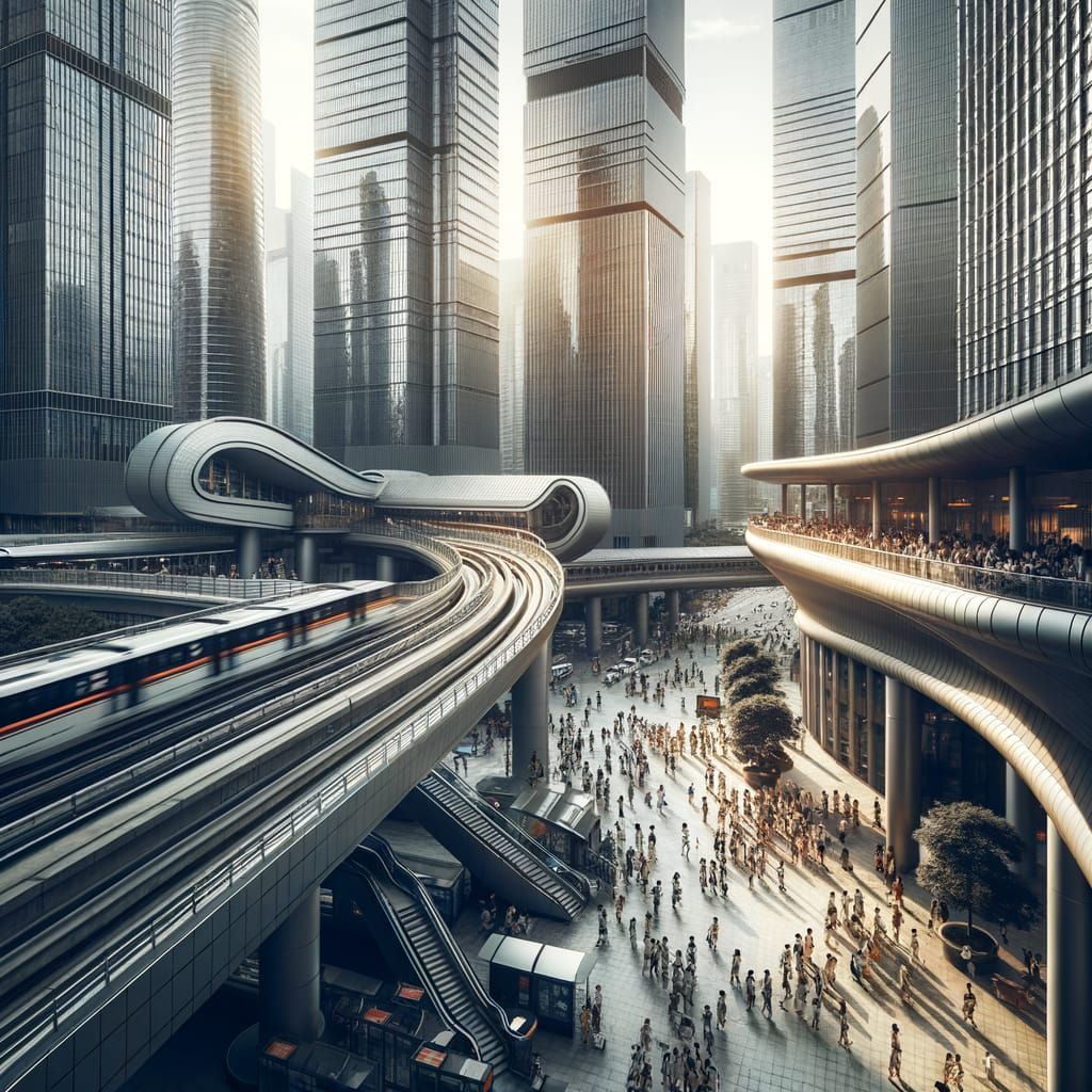 This image depicts a vibrant, bustling metropolis filled with people and modern architecture. Shot with high sharpness and natural light, it features a DSLR-like bokeh effect.
