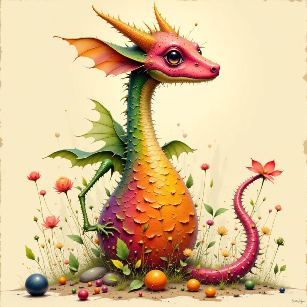 This image shows a small, long-necked dragon with a dragonfruit torso. The scales blend seamlessly with the fruit's texture, rendered in soft pastel colors and intricate detail, as fantastical art.
