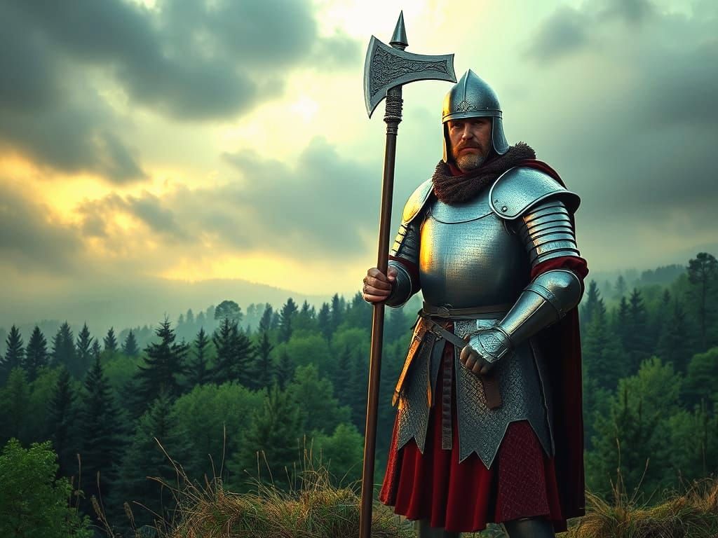 This image shows a strong German soldier on a hill at dawn. He is wearing early plate armor and holding a poleaxe. The artwork features textured, pixelated patterns and volumetric lighting, created as impasto oils.
