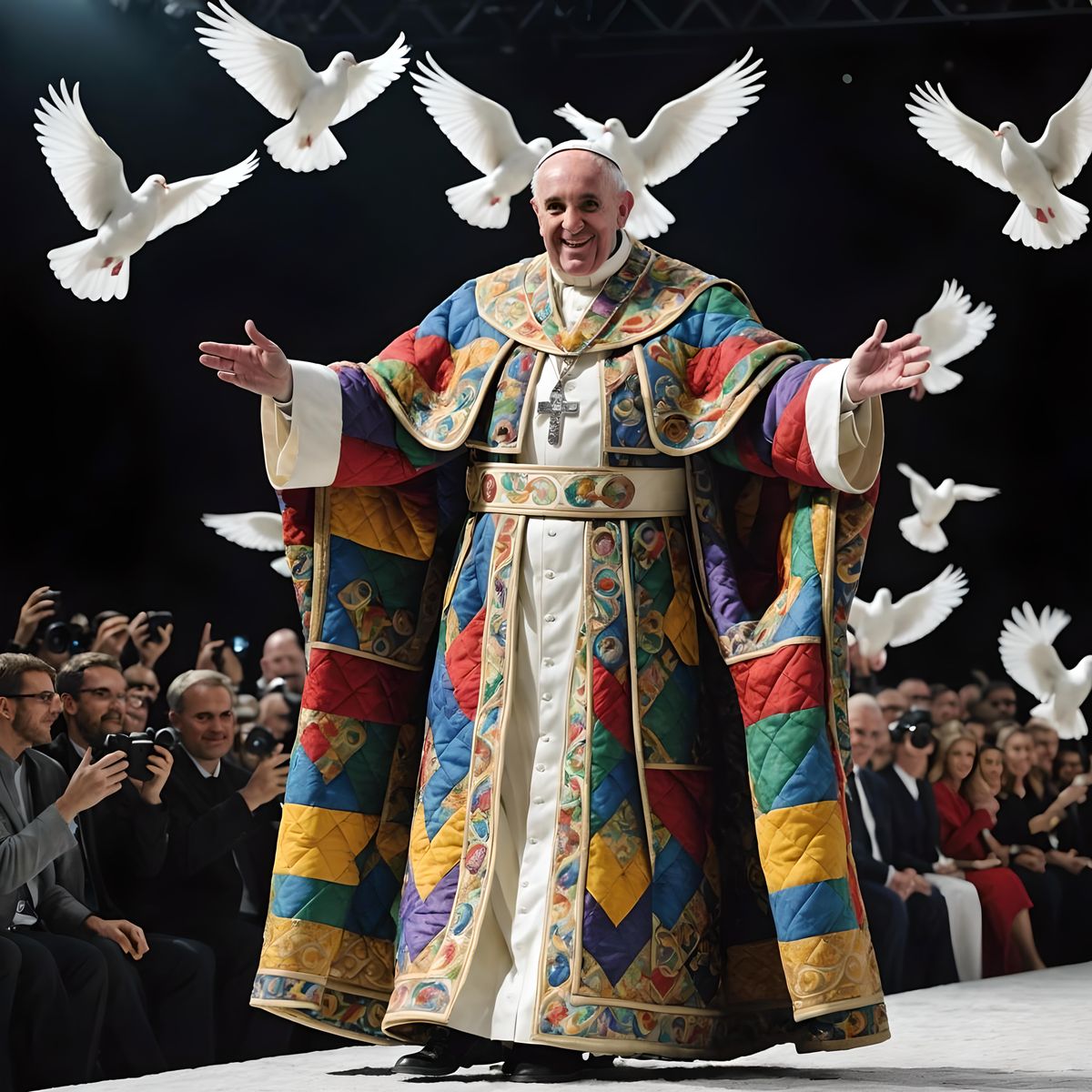 A photorealistic image of Pope Francis on a Milan fashion show catwalk. He is smiling and waving while wearing a long, intricately detailed, heavily quilted robe featuring doves and rainbows.