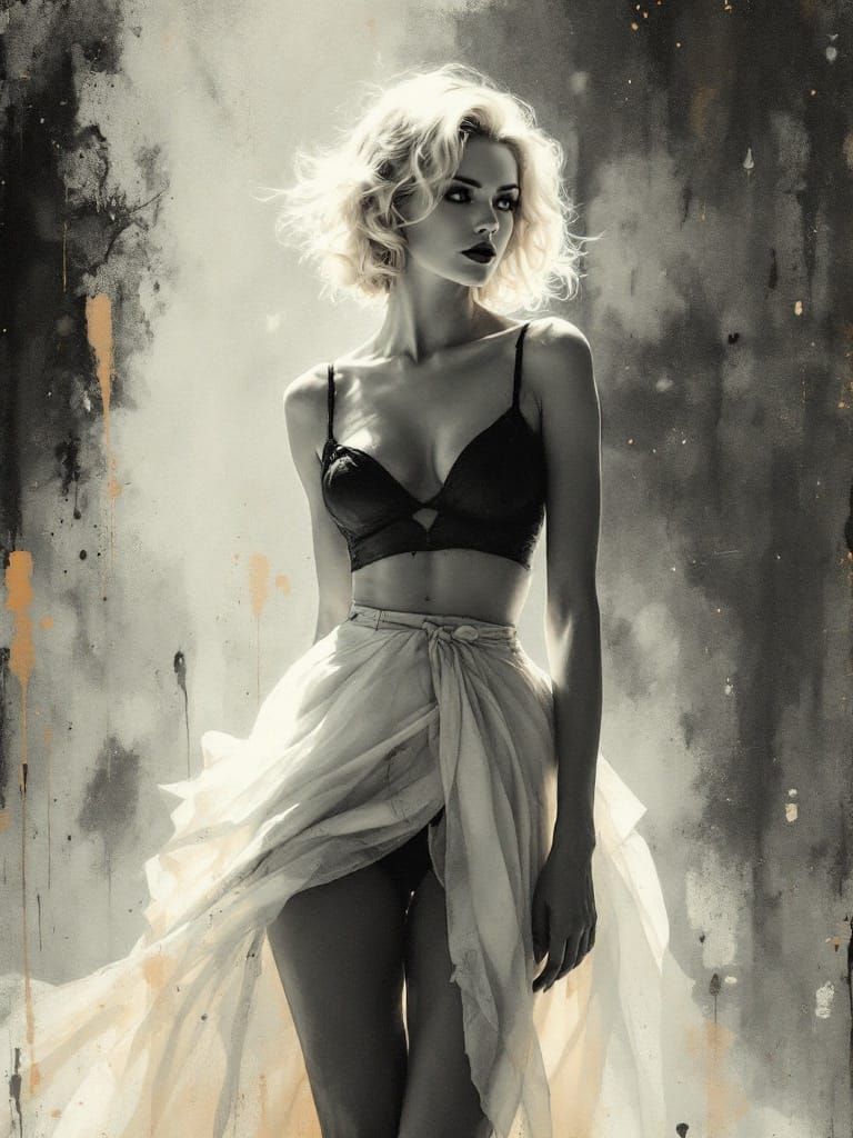 A vintage style portrait of a blonde woman in a white skirt. This image displays an ink bleed effect with translucent watercolor patterns, in the style of idealized naturalism.