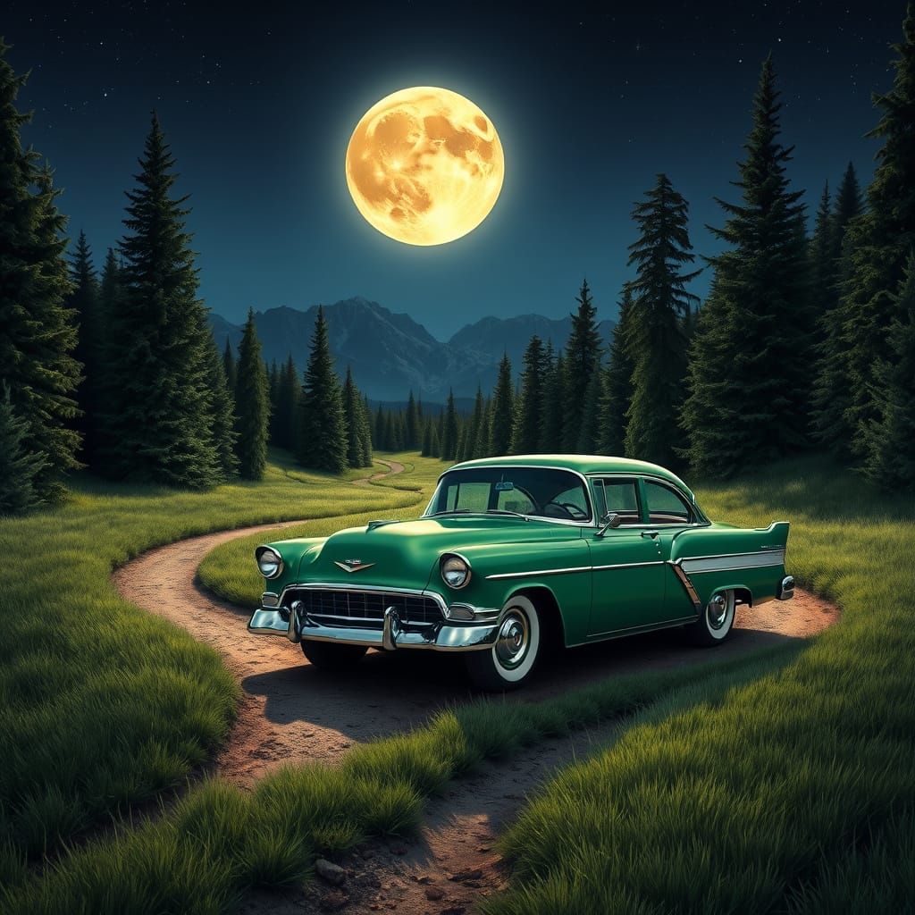 This serene image shows a classic green sedan parked on a winding dirt path, surrounded by lush grass and tall evergreen trees, under a bright full moon and starry sky.