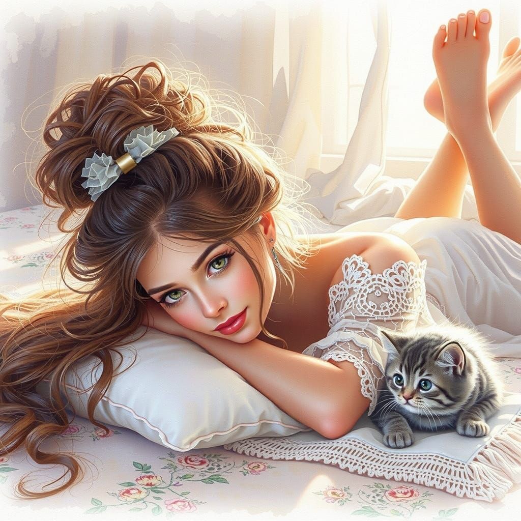 A serene image capturing a brown-haired woman with an elaborate hairstyle lying next to a kitten. The soft, warm lighting accentuates the textures of lace, ribbons, and embroidered pillows in a watercolor and acrylic style.