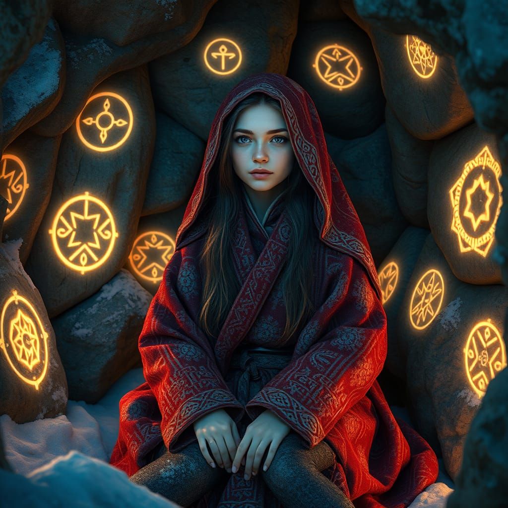 This image shows a young woman in winter robes inside a glowing cave. The scene combines elements of fantasy and gaming aesthetics, with a painterly and rendered style. The image evokes a cinematic atmosphere.