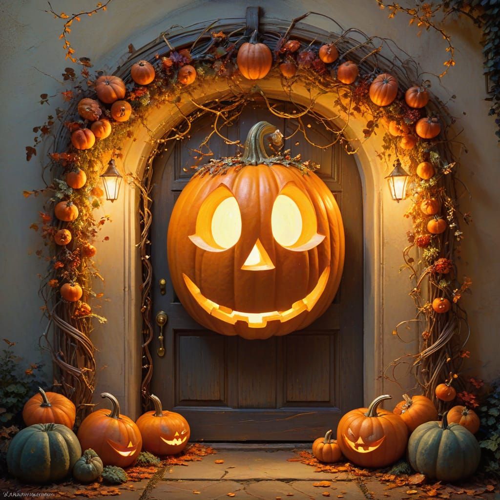 A vibrant oil painting of a door on a giant pumpkin, illuminated by warm golden light. Colorful vines adorn the door, which features a softly glowing jack-o'-lantern face, creating a cozy autumnal scene.