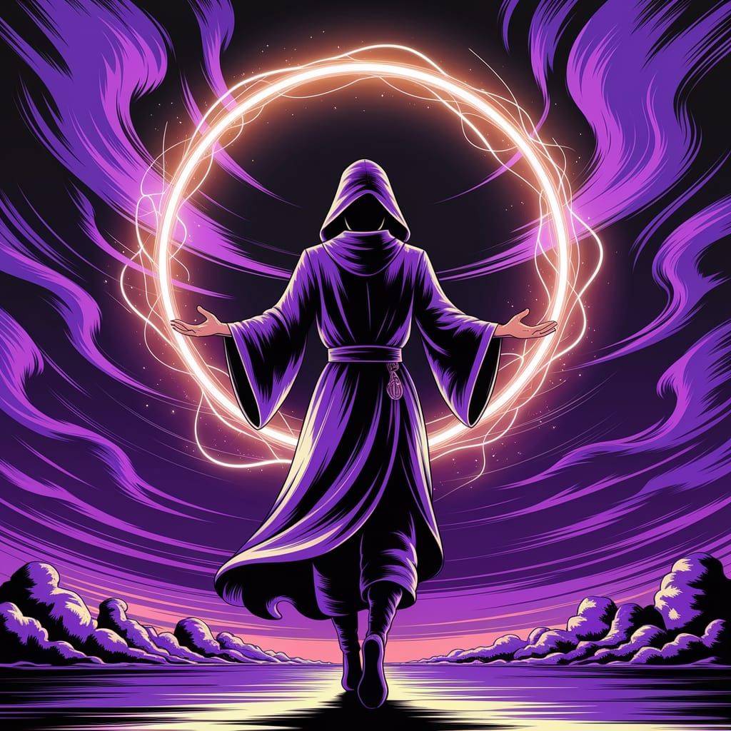 This image shows a mystical figure walking through a dark purple sky filled with vibrant auroras, surrounded by a warm, ethereal aura ring. Rendered in a fantastical digital art style with intricate details and captivating hues.