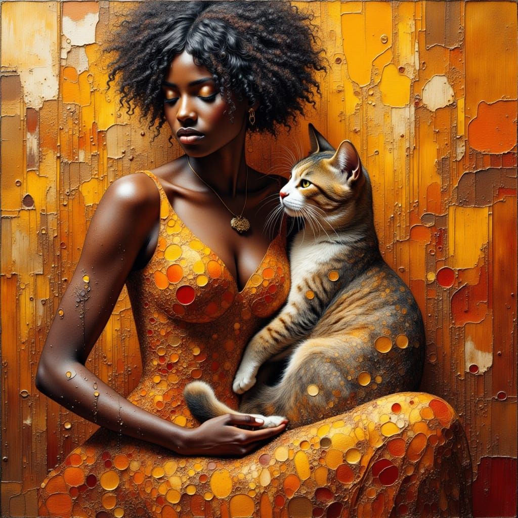 A striking picture of a Black woman sitting with a cat on her lap. The figures are rendered with thick, sculptural brushstrokes in warm earth tones, in an impasto painting style.