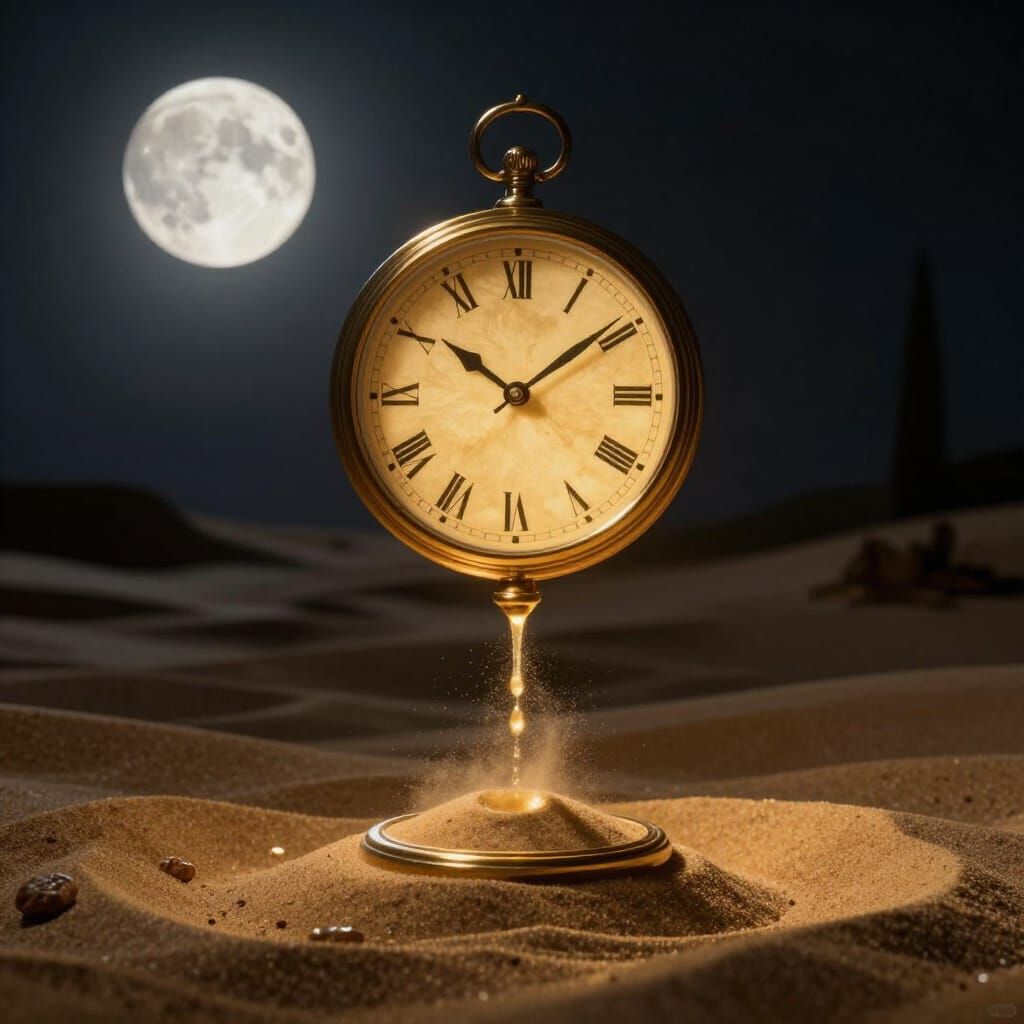 This image shows a golden clock with sand flowing like liquid light in a shadowy, cinematic setting. It's a surrealist artwork exploring the value of time.