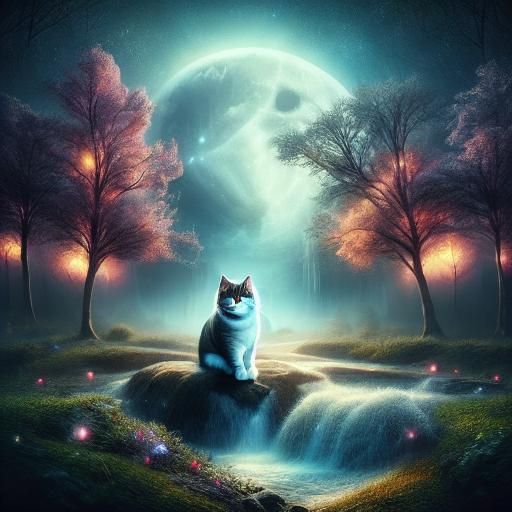 A striking picture of a gray cat beneath a large full moon, captured with soft focus and ethereal lighting. Silvery glows and pastel hues enhance the mystical, surreal atmosphere.