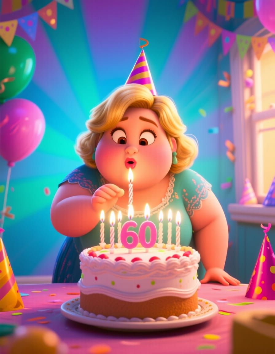 This image shows a cute, chubby blonde woman celebrating her 60th birthday by blowing out candles on a cake. The room is festively decorated. Rendered in a vibrant, cinematic 3D digital art style.