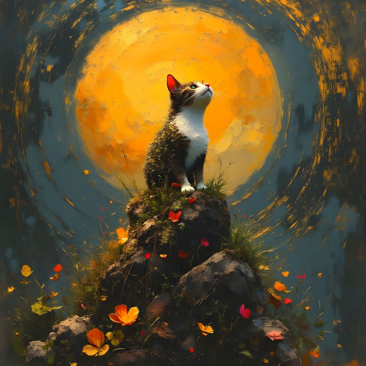 A majestic moss-covered stag adorned with flowers gazes at the moon from a rocky peak. Gold leaf textures and floral accents create a dreamy, ethereal fantasy art nouveau style.