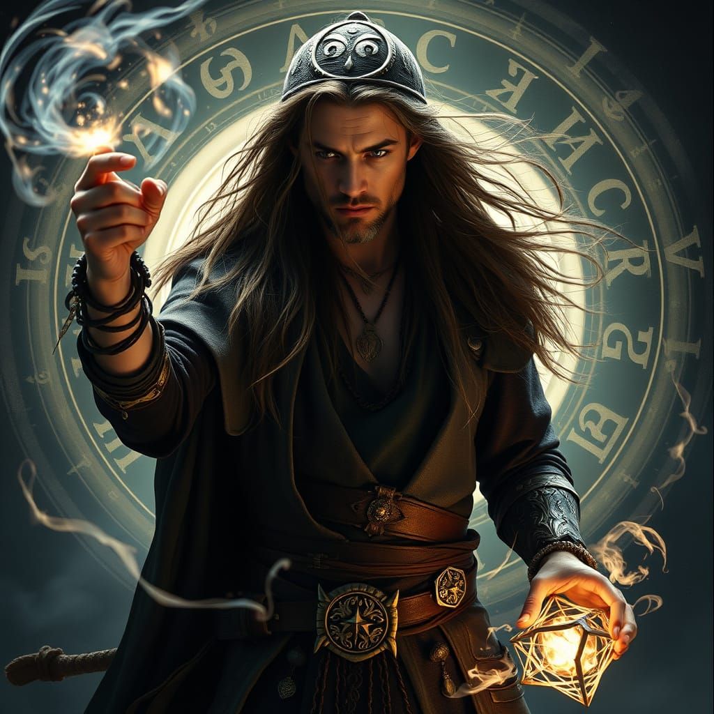This image shows a powerful half-elf wizard casting a spell amidst swirling magical runes, adorned in intricate clothing and enchanted armor, with a striking tattoo and cinematic lighting reminiscent of classic sci-fi art.