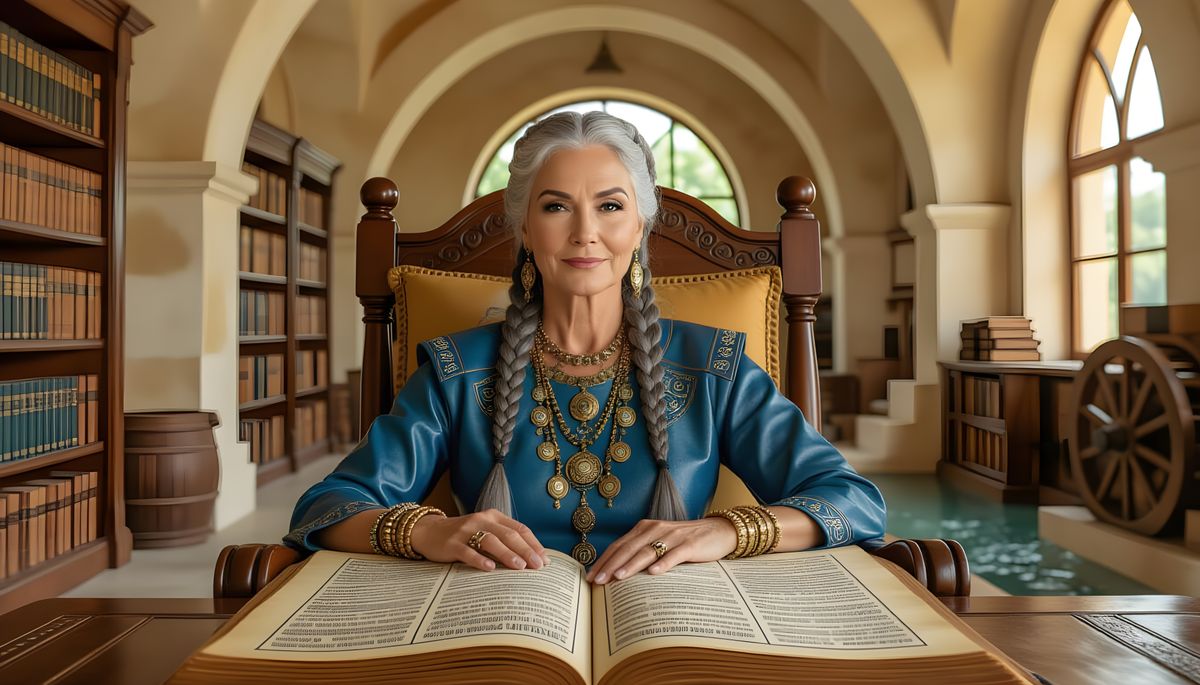 This image shows a serene antique bookstore from the 1700s, featuring stone shelves filled with aged books. A woman in a leather bikini sits on a gigantic book, with a gothic window and waterwheel visible.