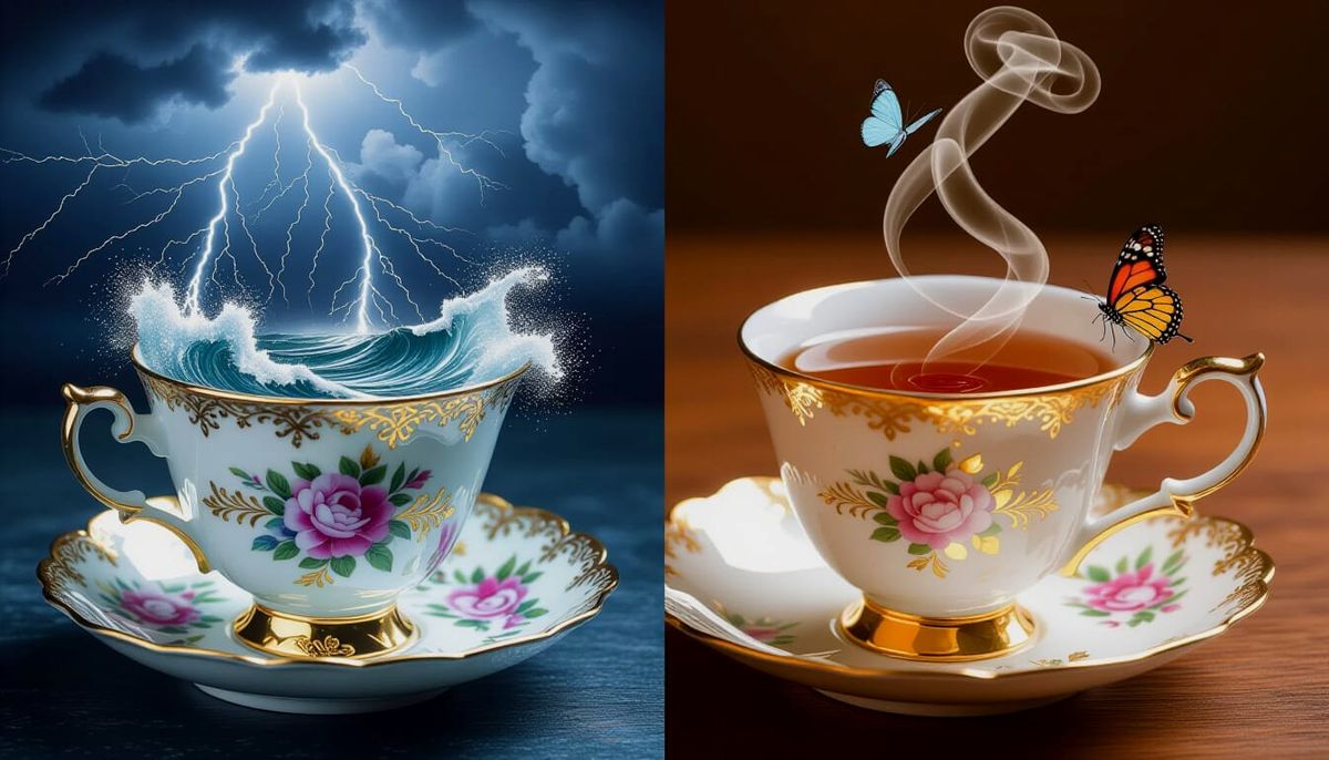 This image shows a duality artwork of an ornate teacup. One side depicts a raging thunderstorm, while the other exudes calm with golden tea and a butterfly, embodying a 'storm in a teacup' concept as photorealistic digital art.