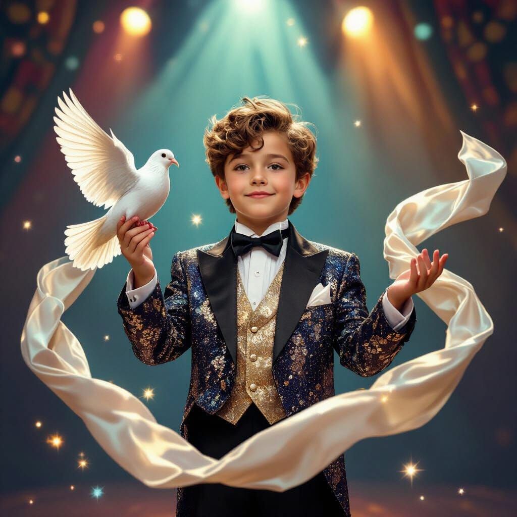 This image shows a young magician performing on stage with a dove and flowing silk scarves. The scene evokes vintage circus posters with vibrant colors and a magical atmosphere.