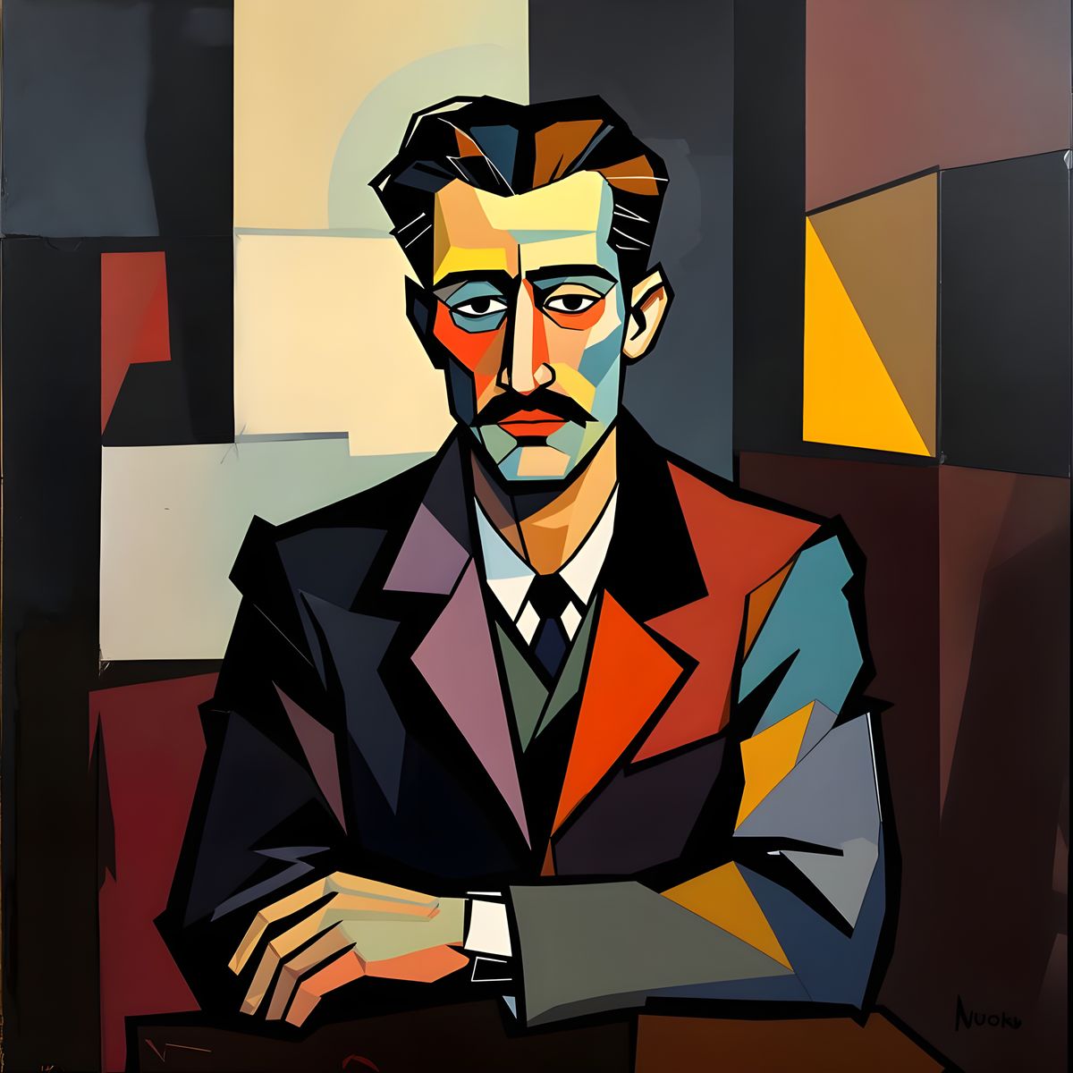 This image depicts an abstract concept related to inaction and silence. The artwork is rendered in a cubist style, fragmenting the subject into geometric forms.