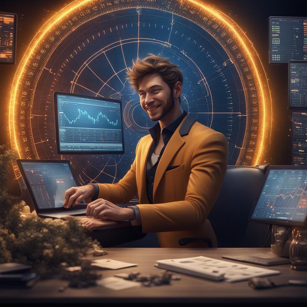 A vibrant digital painting of a young crypto trader celebrating a financial win using Fibonacci charts. The image features deep colors and intricate details, creating a fantastical concept art piece.
