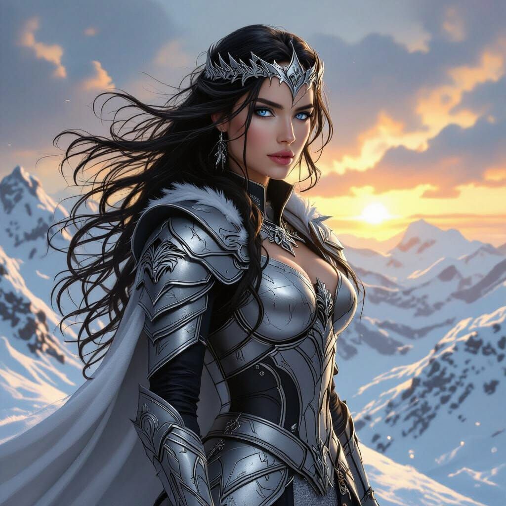 A striking picture of a queen with long black hair and blue eyes, clad in silver armor with a direwolf emblem. She stands on a snowy mountain peak in heroic fantasy art nouveau style.