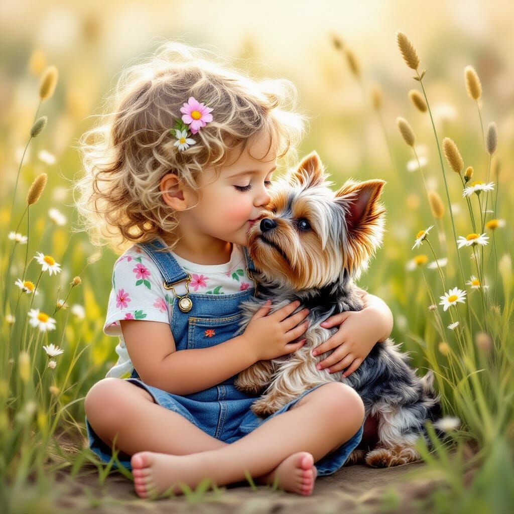 This image shows a little girl with curly blond hair sitting barefoot and cuddling a tiny Yorkshire terrier puppy. She is giving the puppy a kiss in this detailed digital painting.