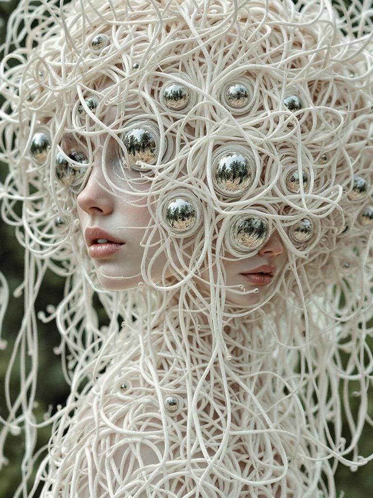she's hollow mirrors on nature mock her embodied ivory-white hair like scaffolding holds a series of recursive wild mirrors climbing up and around her bunched hair-strands in layered hollowness reflecting the futility of right now pull back into a wide angle wild angle full-length long shot mirroring ...
