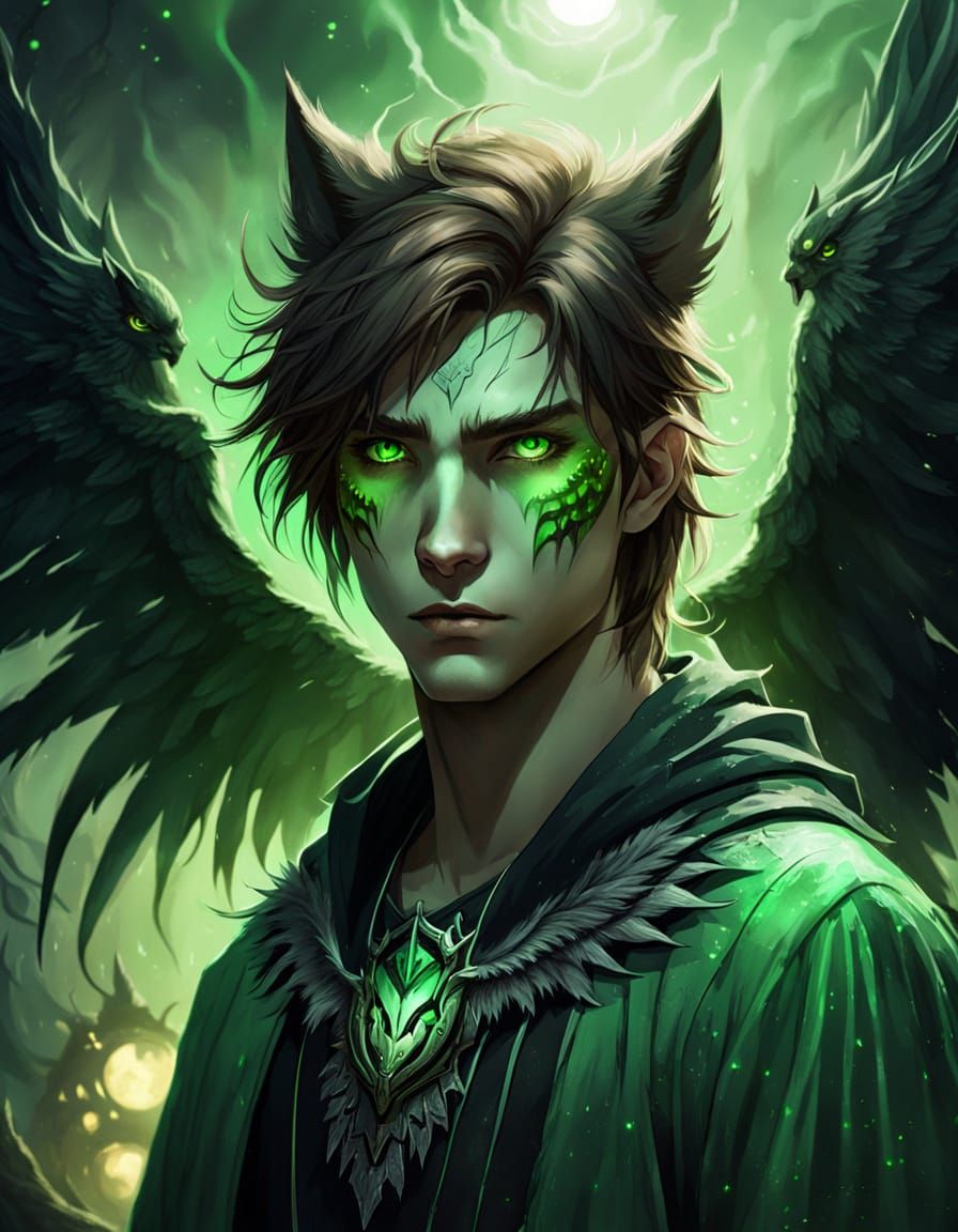 Close-up fantasy concept art of a teenage vampire wolf boy with wings, featuring glowing green eyes and a green tunic. Rendered in a moody, dark fantasy style with cinematic lighting.