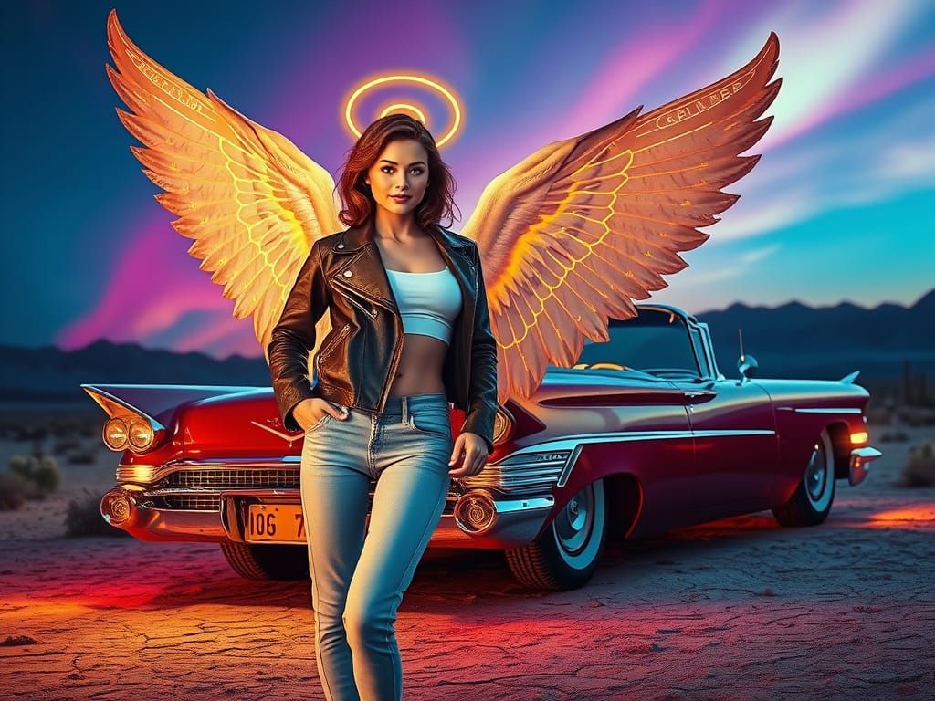 A captivating image of a young angel with iridescent wings, dressed in 1950s attire, leaning against a Cadillac in the desert. The image is reminiscent of retro-futurism with cinematic lighting.