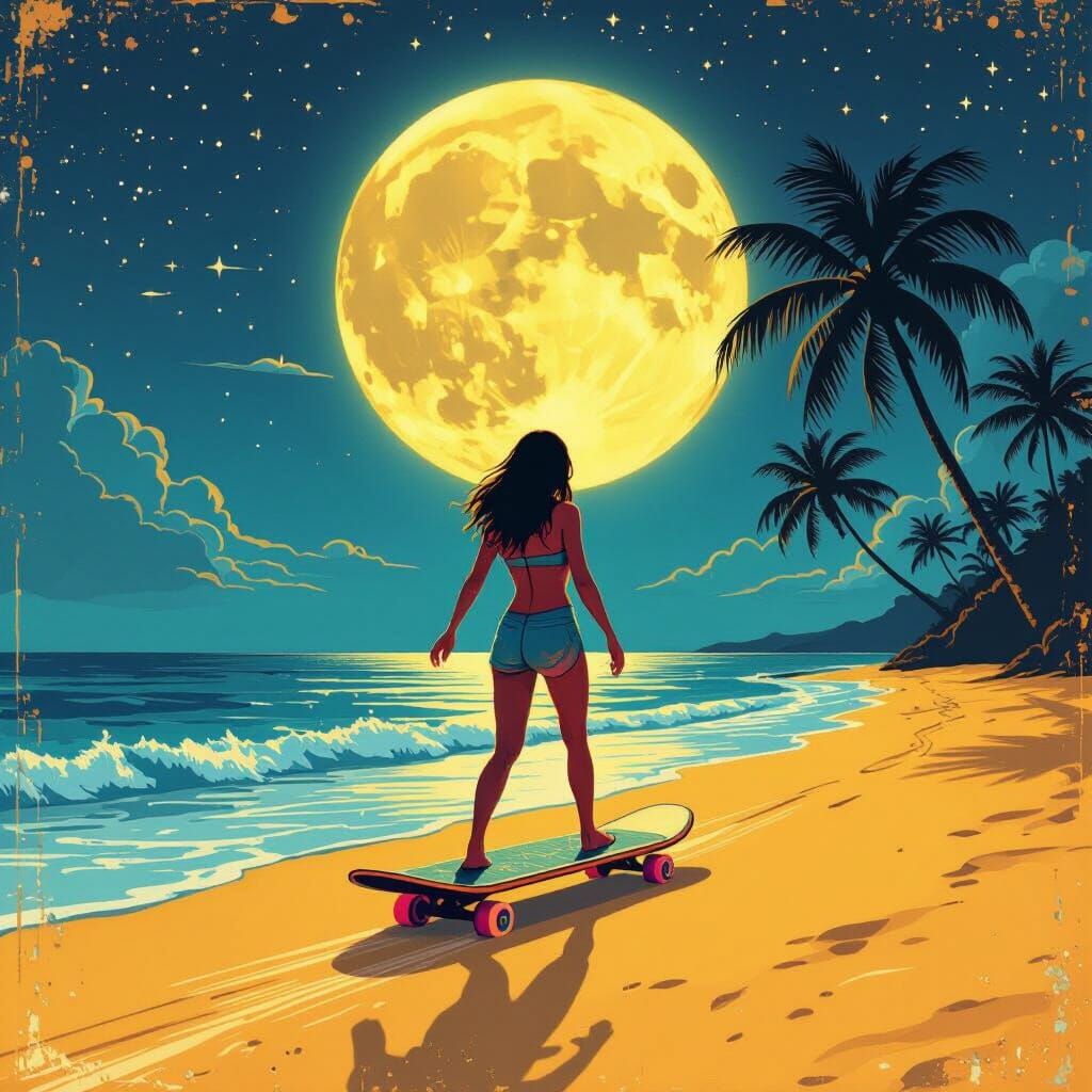 This image shows a woman surfing at night under a full moon. Palm trees surround her, illuminated with a neon glow. The artwork is reminiscent of 1970s retro illustrations with faded colors and a distressed texture.