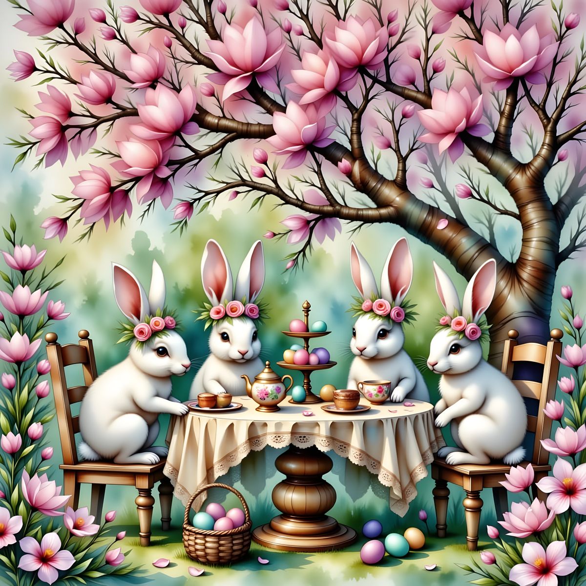 This highly detailed watercolor illustration depicts a charming outdoor tea party with bunnies in floral crowns, set beneath a blooming cherry blossom tree. Features include vintage china, pastries, and falling petals in a pastel palette.