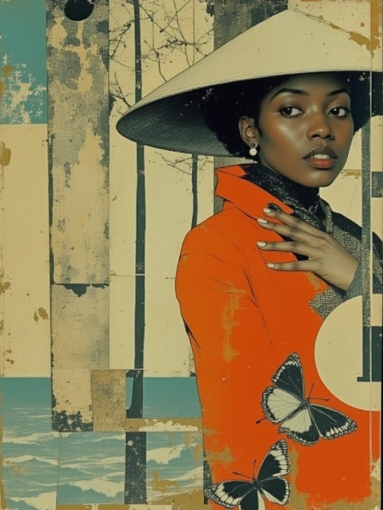 This image depicts a fashion model in a zoot suit, surrounded by lush butterflies in a kaleidoscopic paradise. The model's extravagant straw hat and intricate details evoke a jazzy, cinematic atmosphere, blending Maxfield Parrish's drama with Paul Klee's expressive brushstrokes.