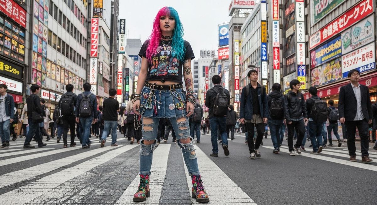 A striking picture of a gyaru girl in Shibuya, Japan, amidst graffiti and neon. Her vibrant attire blends punk and traditional styles. The image captures the unique urban energy in vivid colors.
