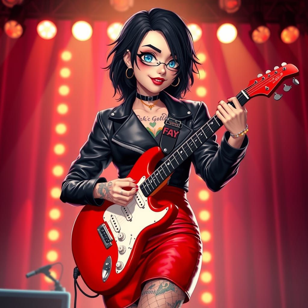 A striking picture of a rockabilly woman playing electric guitar on stage. The artwork features a hyper-realistic 3D anime style with glowing eyes, detailed tattoos, and neon lighting.