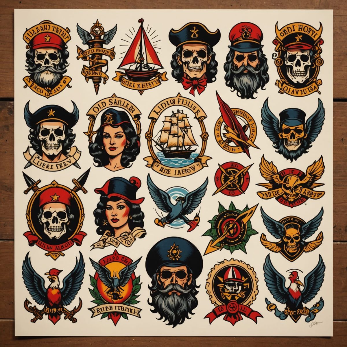 This image shows a traditional flash sheet of vintage-style tattoos. The designs are reminiscent of classic Sailor Jerry tattoos, featuring bold lines and nautical themes.