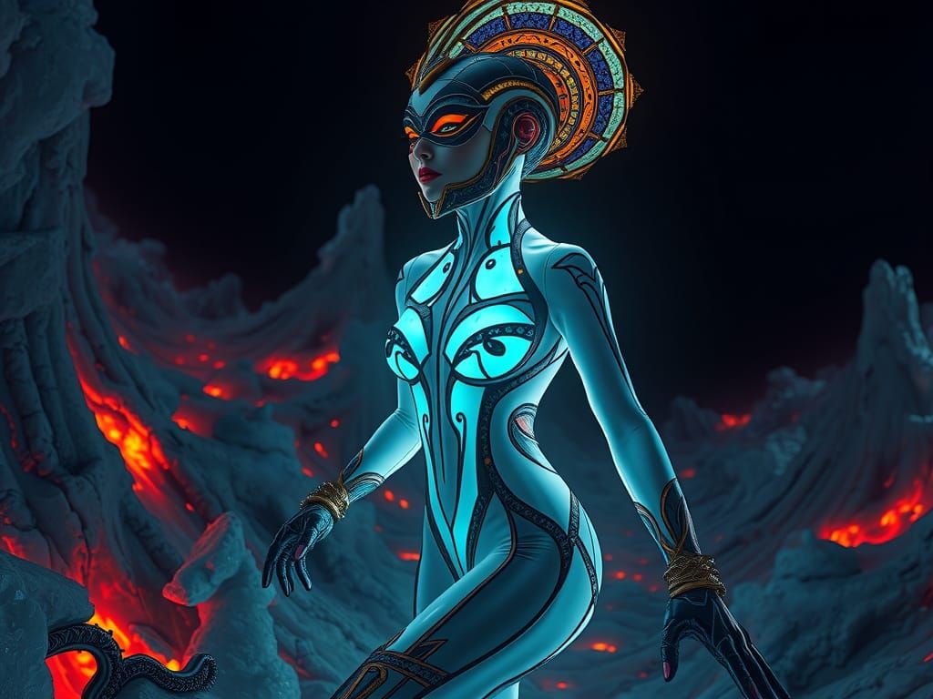 A striking picture of a woman in bioluminescent, stained-glass-inspired attire navigating a dark, fiery, icy alien ocean. This photorealistic image evokes cosmic horror with dramatic lighting.