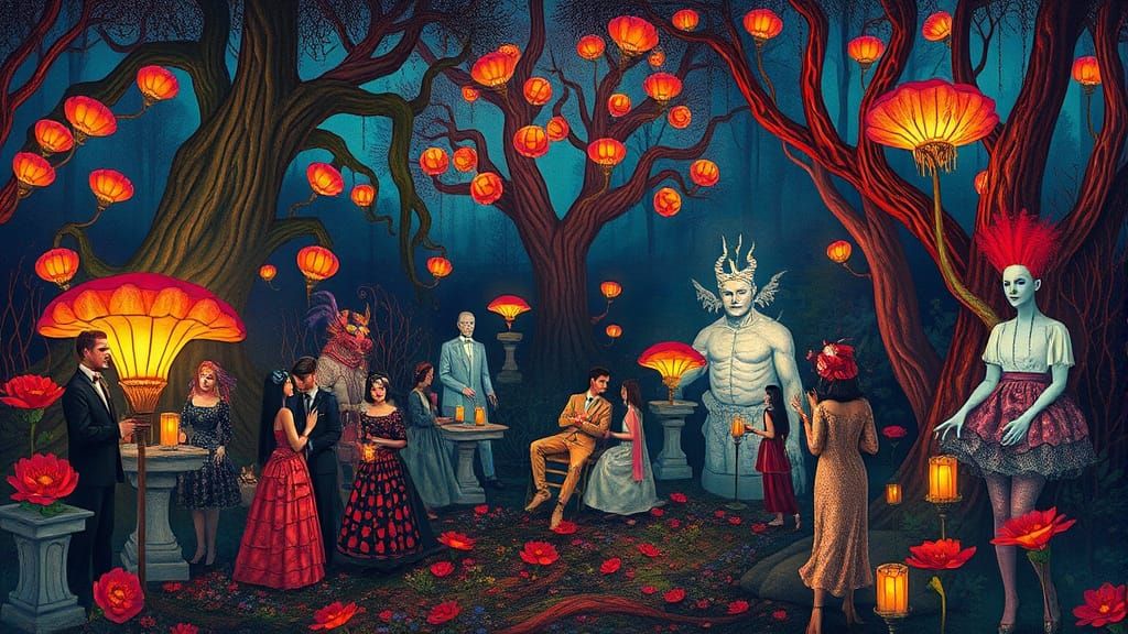 A surreal garden party with guests in costume amongst glowing flora. The scene is populated by dreamlike creatures in a vibrant, psychedelic style reminiscent of paper collage.