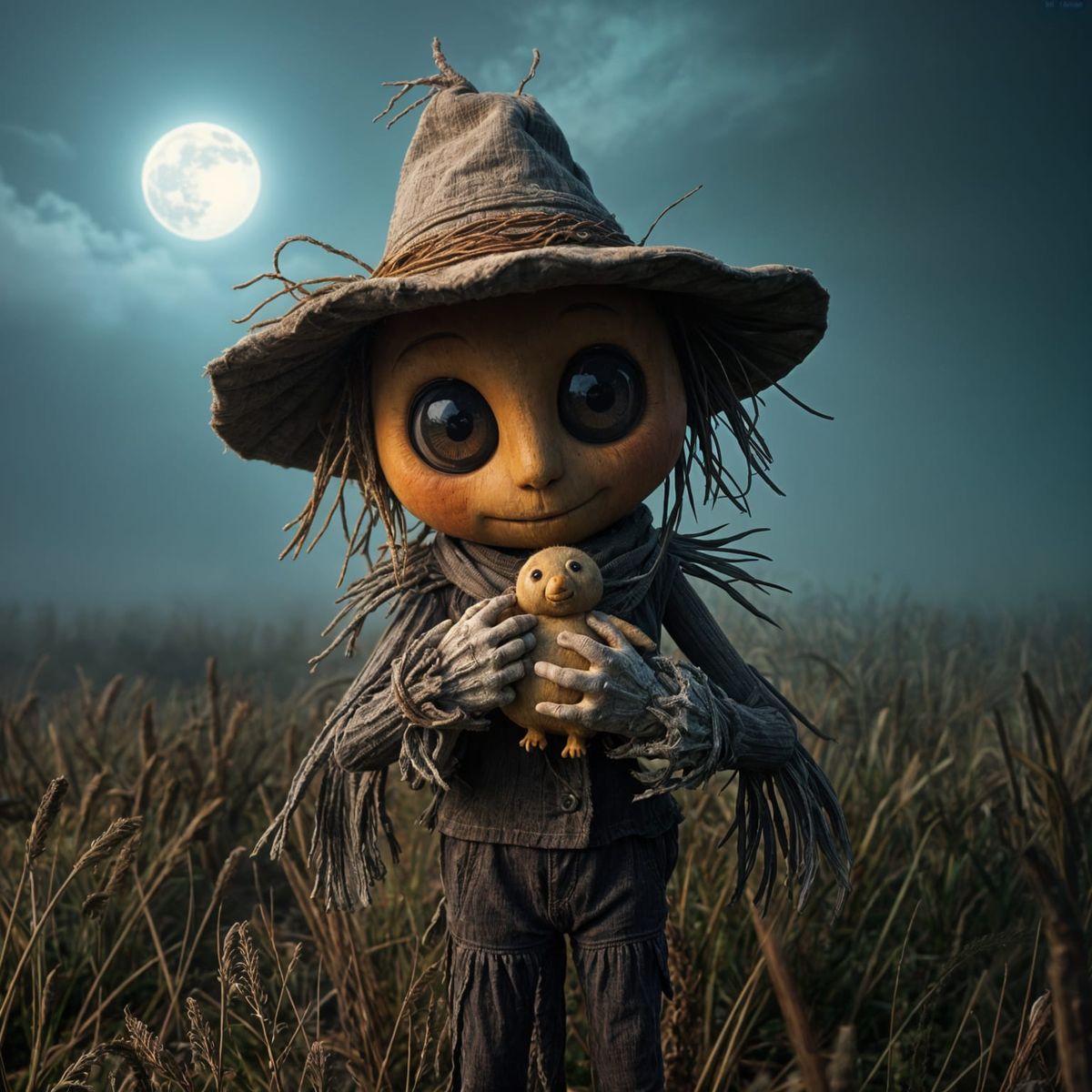 A whimsical scarecrow stands in a misty field, clutching a teddy bird. This fantasy art features dramatic lighting and hyper-detailed textures, creating a surreal and mischievous scene.