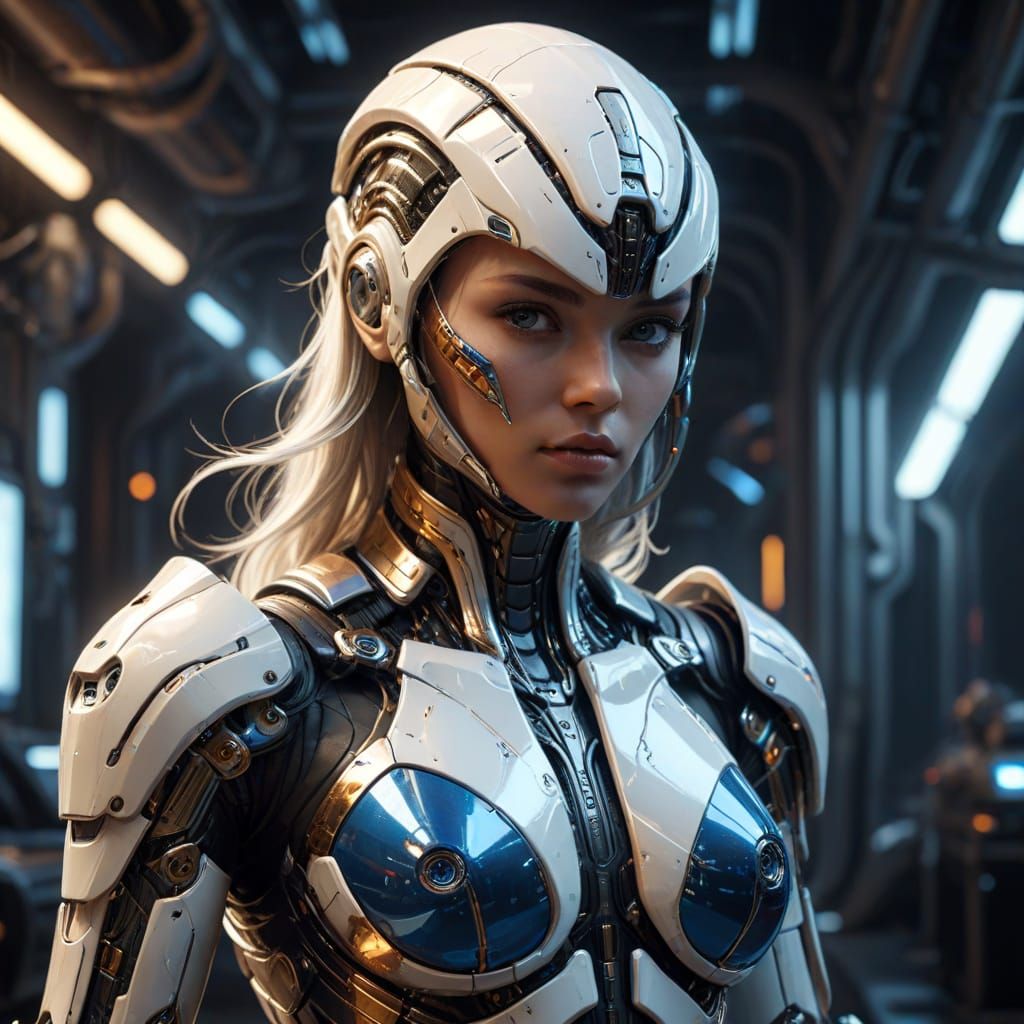 This image depicts a strong female warrior clad in sleek, skin-colored robotic armor, surrounded by advanced technology and elegant flowing fabric, with a focus on metallic surfaces and glowing blue accents in a hyper-realistic digital art style.