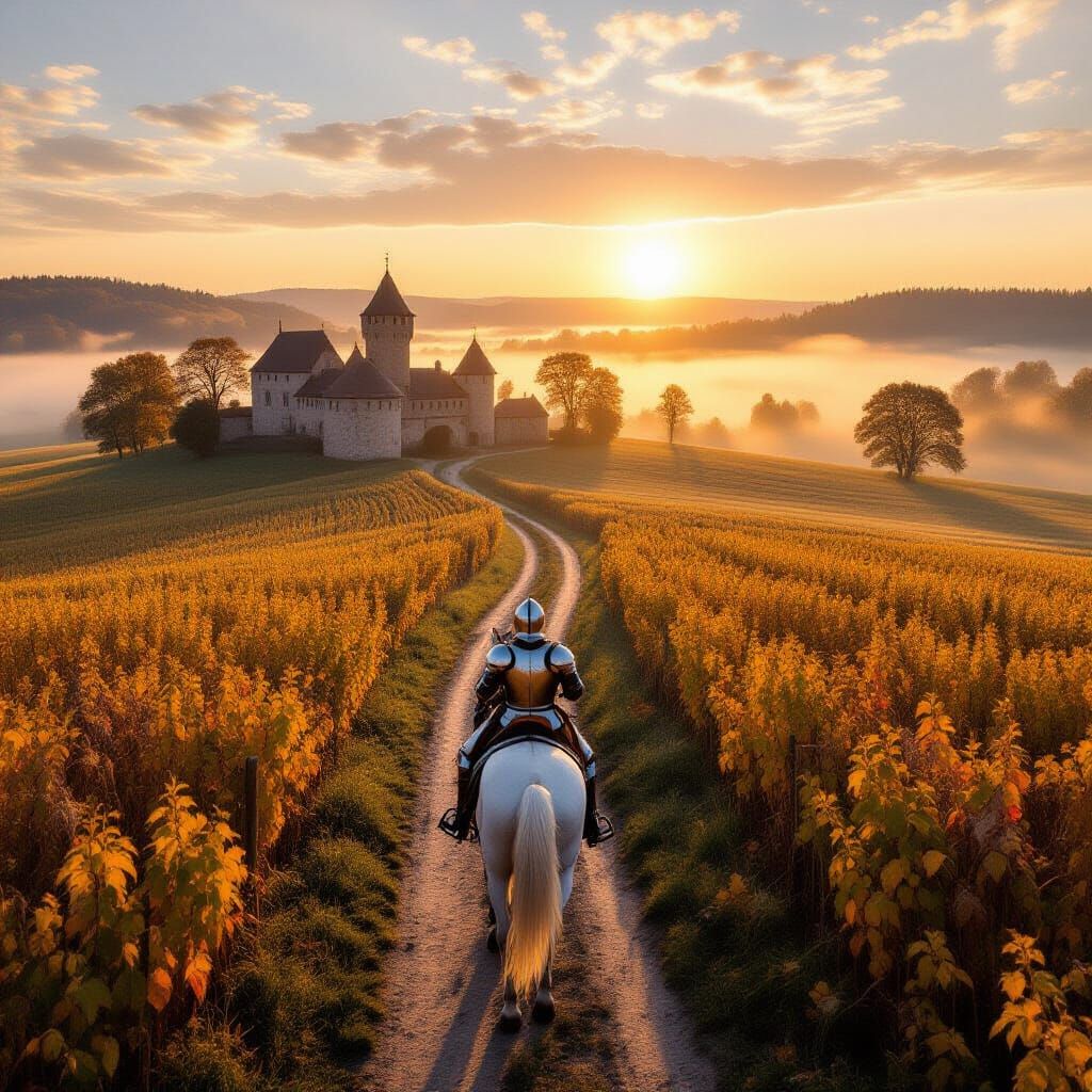 This top-down oil painting captures a knight on a white horse at dawn, near a medieval city. A path leads through autumn fields to a forest, bathed in diffused sunlight.