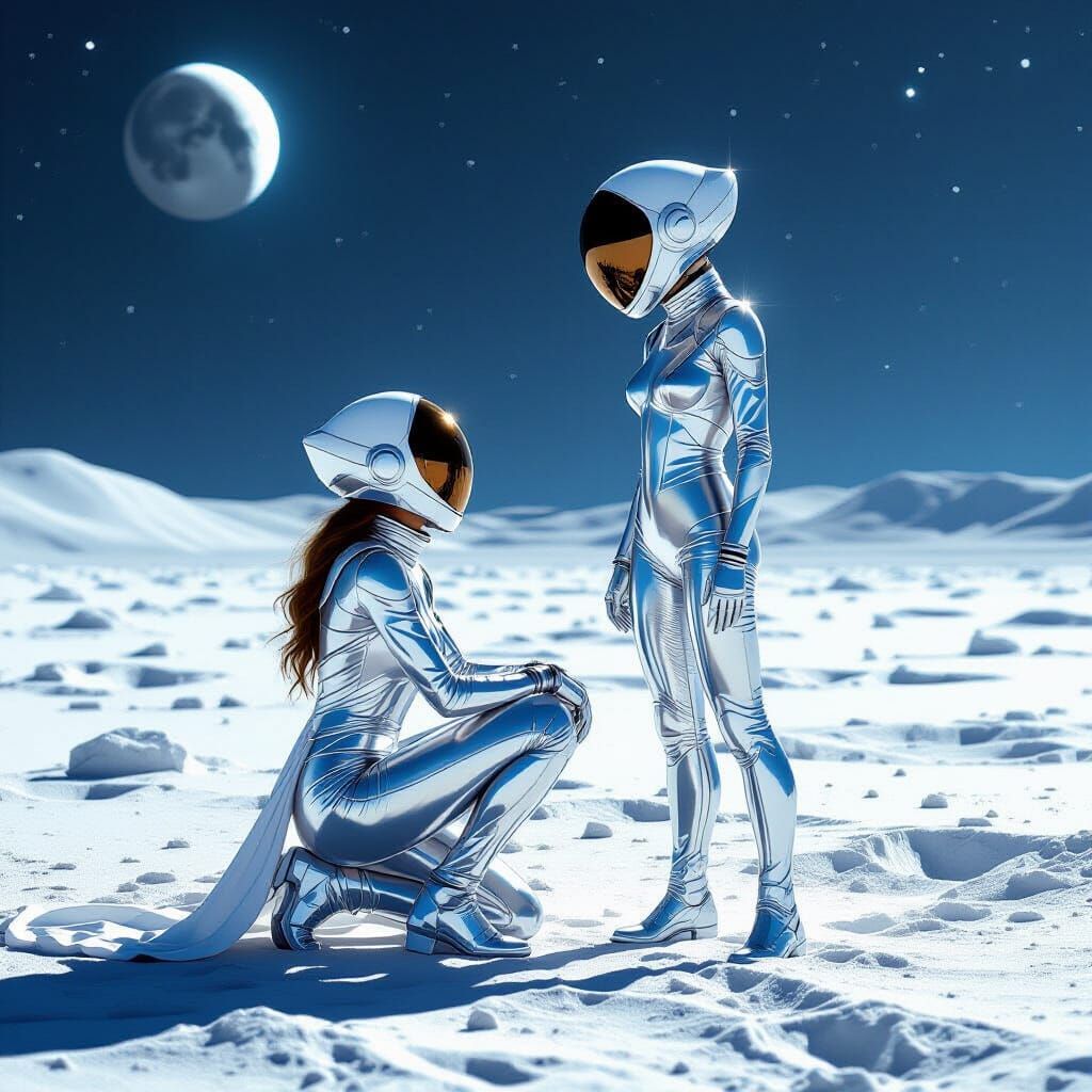 A striking picture of a female alien in a metallic suit seducing an astronaut on the moon. The image blends sci-fi futurism with cosmic mysticism, in a distinctive retro-futuristic style.