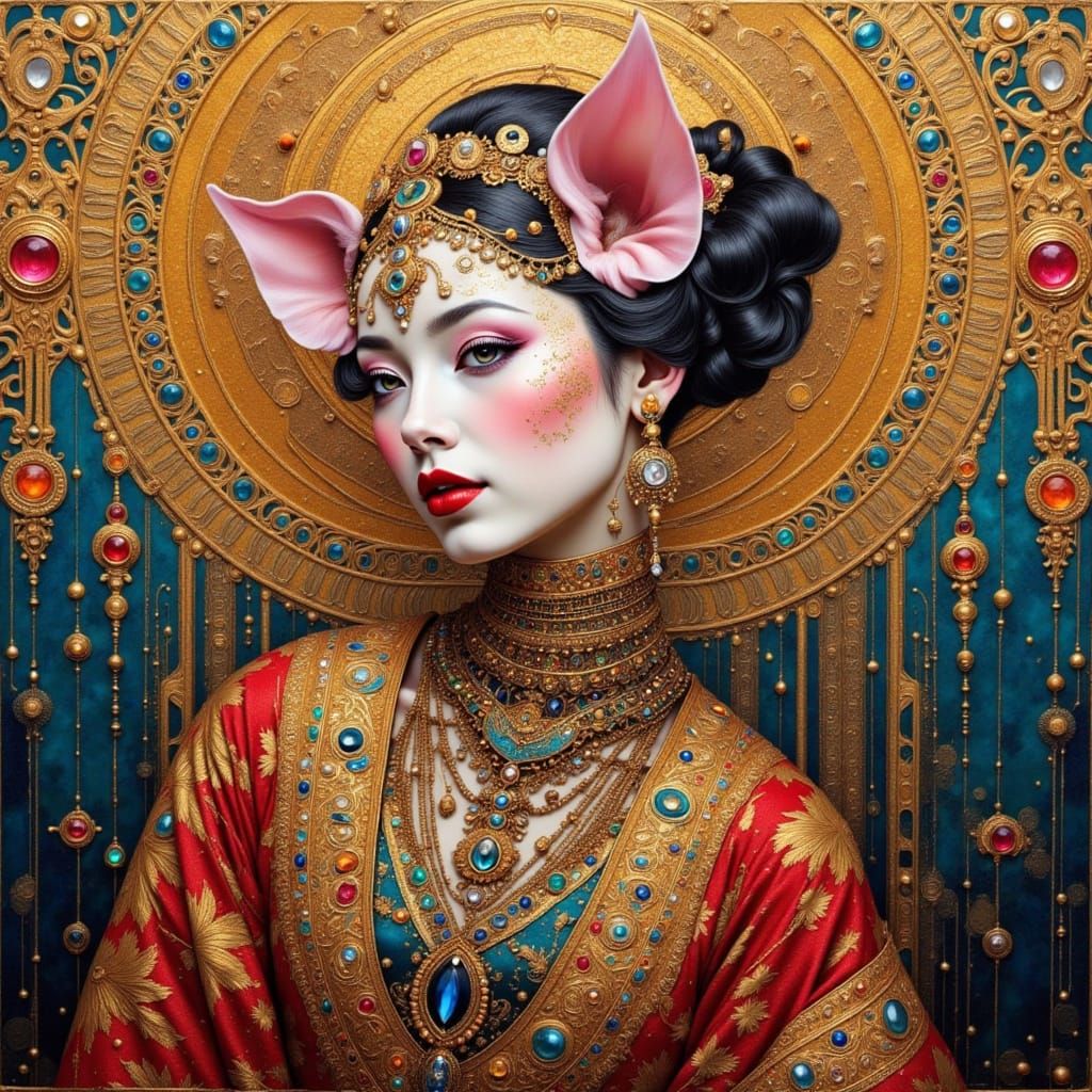 A striking picture of a pig in ornate clothing against a gemstone background. The image blends art deco and nouveau styles with expressionist oil and acrylic techniques.